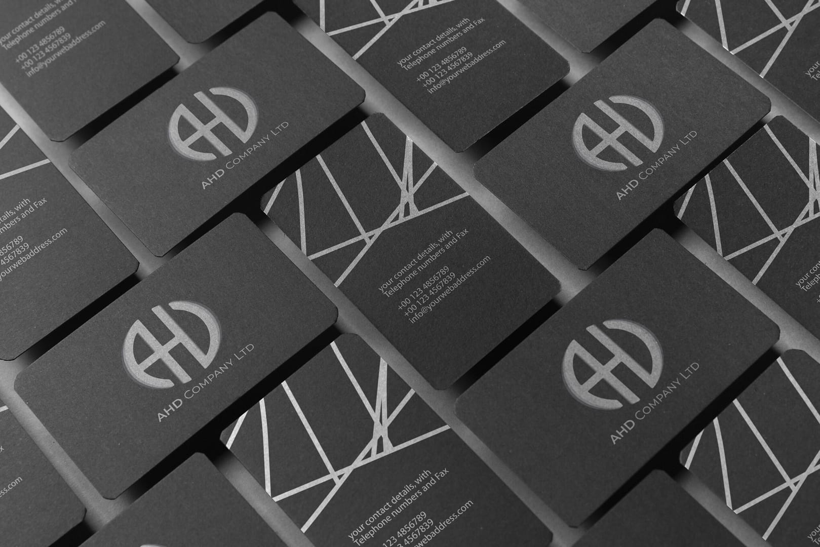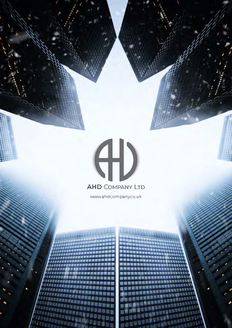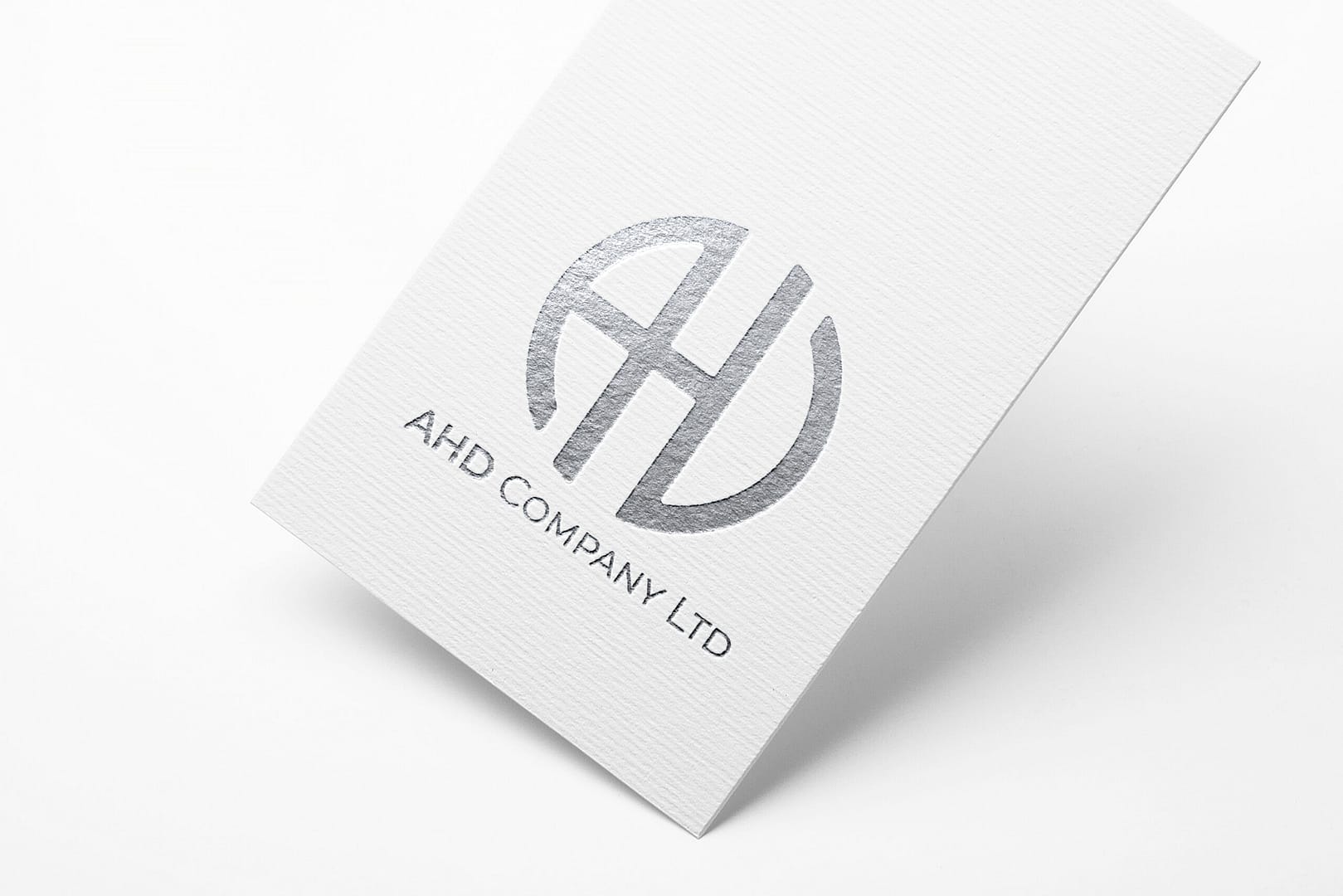 Tipografia: Il font semplice e sans-serif del testo sottostante “AHD Company Ltd” bilancia il simbolo con un aspetto chiaro e leggibile, rafforzando il messaggio di trasparenza e professionalità.